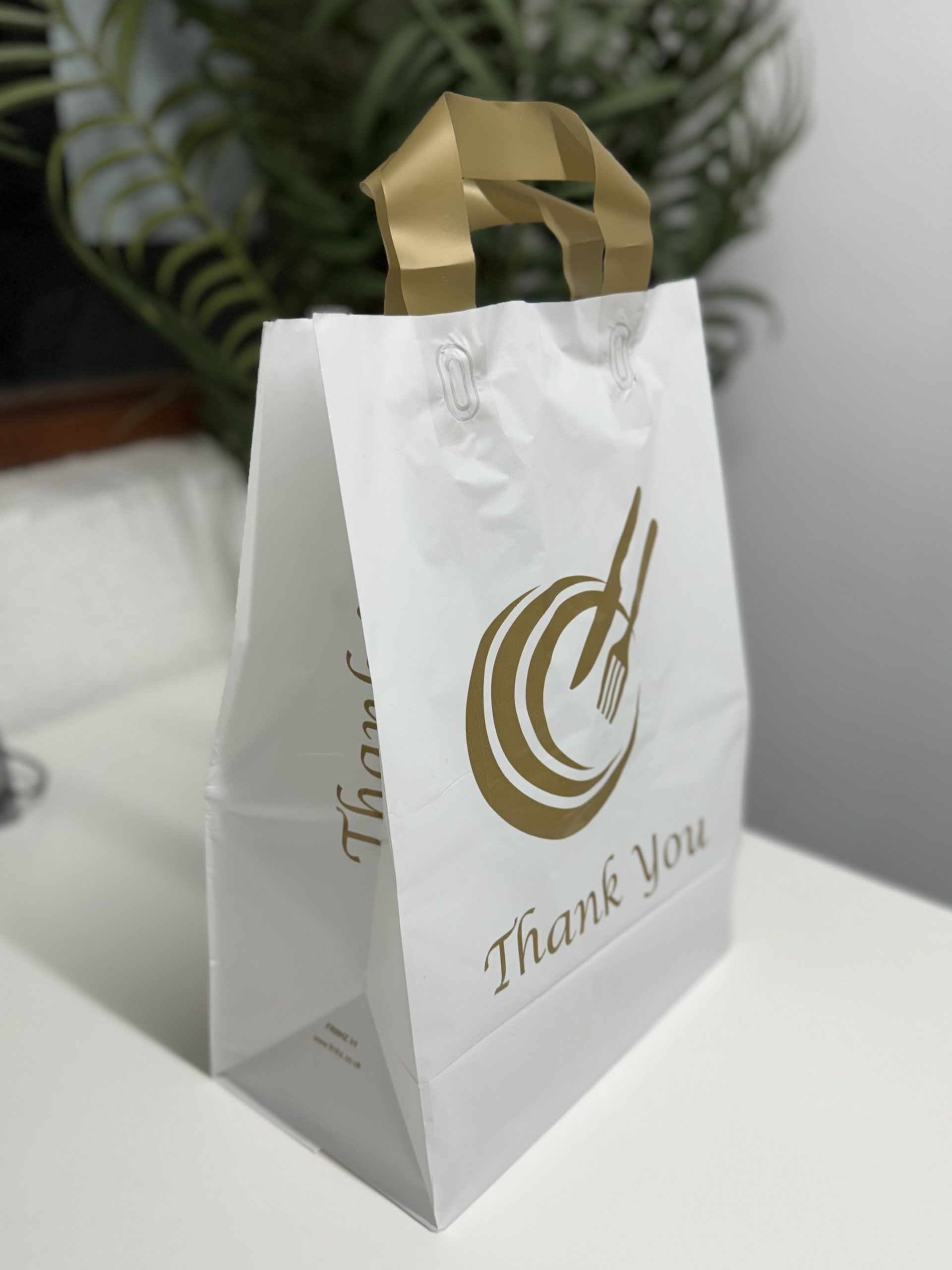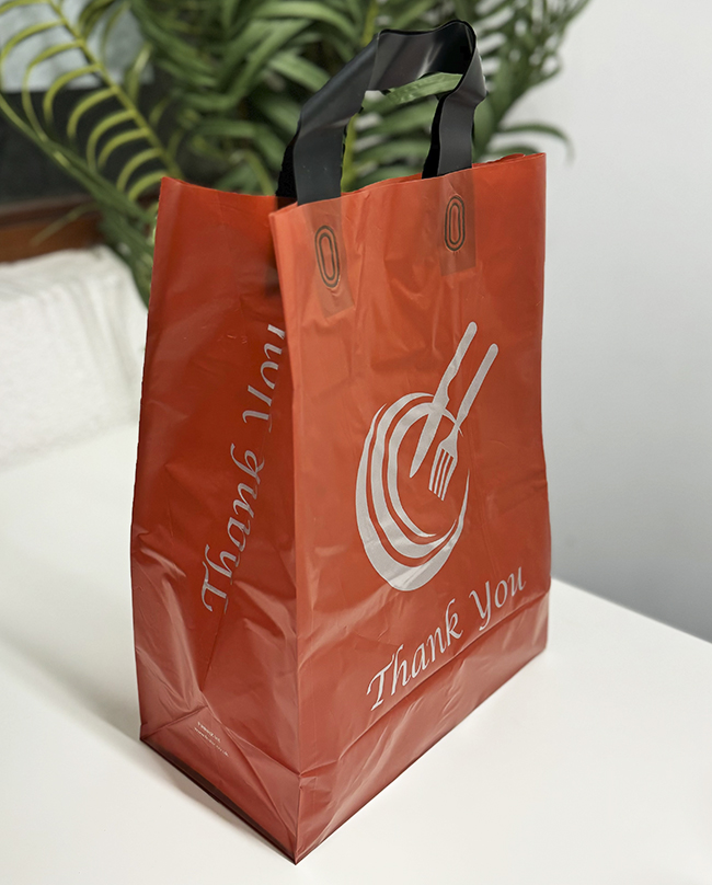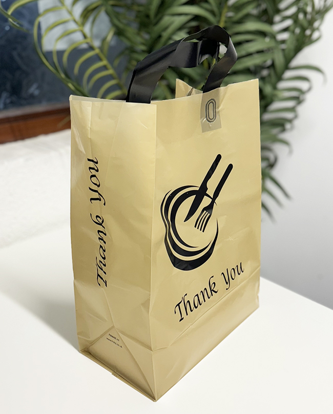 Serve your customers in style with our premium HDPE takeaway bags featuring durable soft loop handles and a reinforced cardboard base for extra strength. Perfect for restaurants, takeaways, and retail stores, these bags combine practicality with a professional look.